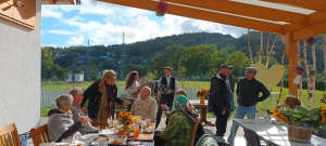 Für die Feste bei unserer SoLaWi bringt in der Regel jeder was mit, sodass sich ein buntes Buffet aus verschiedenen Salten, Dips und Backwaren aufbaut. Das ist schonmal ein kulinarisches Highlight. Wenn dann auch noch der Grill läuft und eine Vielfalt von Maiskolben über Gemüsetaschen bis Nackensteaks gebrutzelt werden, bleiben keine Wünsche offen. Begleitet wurde das Ganze von einer Weinprobe, die von Natalie Richter vom Bio-Weingut Richter aus Ahrweiler angeboten wurde. Dabei wurde auch gleich herumgesponnen, ob es nicht auch solidarisch produzierten Wein geben könnte?