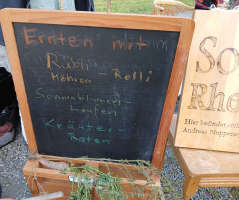 Während einige Helfer noch dem ebenfalls reichlichen Beikraut in den Möhren zuleibe rückten, warf Mario Schmitz schonmal den Schwenkgrill an. Bei kühlen Getränken genoss man kurz darauf in der von Familie Schmitz bereit gestellten Sitzgruppe hauptsächlich vegetarisches Grillgut und Salate - unter anderem einen Kartoffelsalat fast komplett aus Gemüse vom Acker in Birresdorf. Nun war auch Gelegenheit für Kennenlernen und persönlichen Austausch der Konsument:innen aus Bad Breisig, Sinzig und Remagen untereinander.