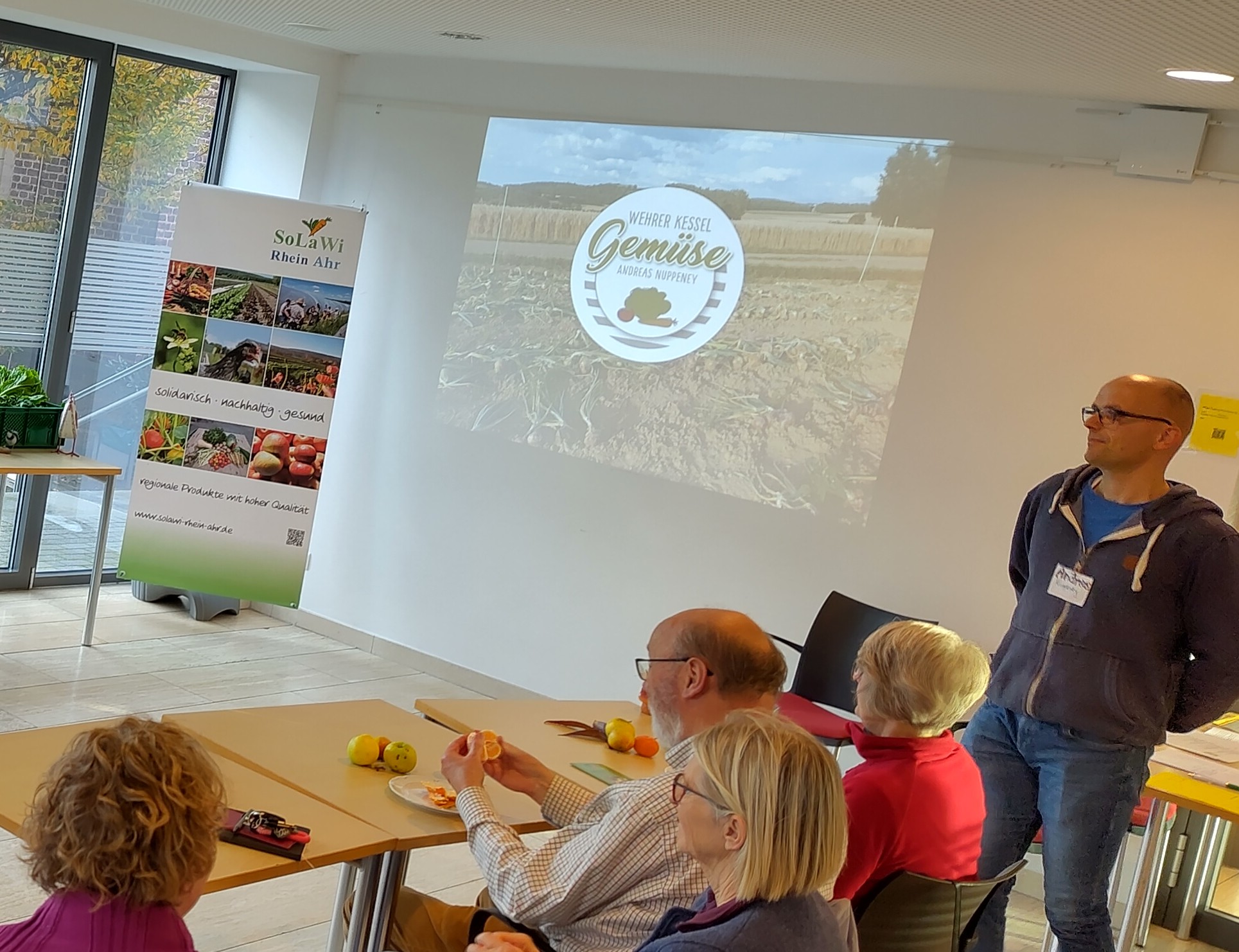 Anschließend stellte Andreas Nuppeney seinen Weg von der Konventionellen Landwirtschaft zum bio-zertifizierten "Wehrer Kesselgemüse" dar und skizzierte auch kurz seinen Lebenslauf. Er wollte weg von der Über- und Massenproduktion und nicht abhängig sein von den Vorgaben des Lebensmitteleinzelhandels, die nur "genormtes Gemüse" abnehmen. Bei der SoLaWi werden auch krumme Möhren, Riesen-Kohlrabi und andere Feldfrüchte, die nicht die Standardmaße erfüllen und somit normalerweise nicht vermarktbar wären, an die Konsumenten weiter gegeben, so dass nichts weggeworfen werden muss. Wichtig ist ihm zudem die Planungssicherheit, die er durch die bei der Bieterrunde vereinbarten Preise pro Gemüseanteil erhält. Diese basieren auf einer Kalkulation, welcher Richtpreis für ihn kostendeckend ist. Bei der SoLaWi Rhein-Ahr finden sich glücklicherweise immer genügend solidarische Konsumentinnen, die diesen Richtpreis oder sogar einen etwas höheren Betrag zahlen, so dass auch einzelne Konsumentinnen berücksichtigt werden können, die sich den Richtpreis nicht leisten können und etwas weniger zahlen. Dies ist ein weitere Aspekt der Solidarität: Hier sind die Konsumentinnen untereinander solidarisch.
